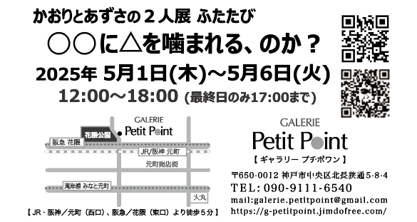 かおりとあずさの2人展 ふたたび!! 生きとし生けるもの・・・なんでもござれで自由気ままに大騒ぎ! 持ちつ持たれつ、噛みつ噛まれつ(?)いろいろあるけど それなりにホドホドみんな仲良くやっていければいいですよね(と、いつもの如くコンセプトがあるのやら無いのやら。。そこはお気になさらず楽しんでくださいませ~) 5月1日(木)から5月6日(火)まで、昨年と同じく神戸元町 花隈公園前のギャラリー プチポワンにてお待ちしております!